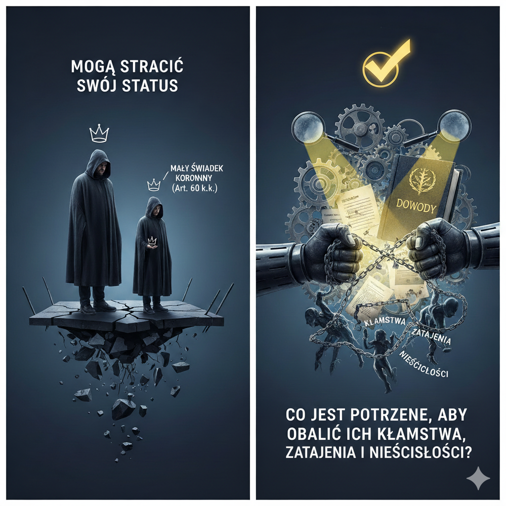 Co jest potrzebne, aby obalić ich kłamstwa, zatajenia i nieścisłości Wprowadzenie Instytucja świadka koronnego oraz nadzwyczajnego złagodzenia kary na podstawie art. 60 §3–4 kodeksu karnego opiera się na jednym, fundamentalnym założeniu: pełnej, rzetelnej i lojalnej współpracy z organami państwa. Każde odstępstwo od tego standardu – w szczególności kłamstwo, zatajenie istotnych faktów lub manipulacja personalna – […]