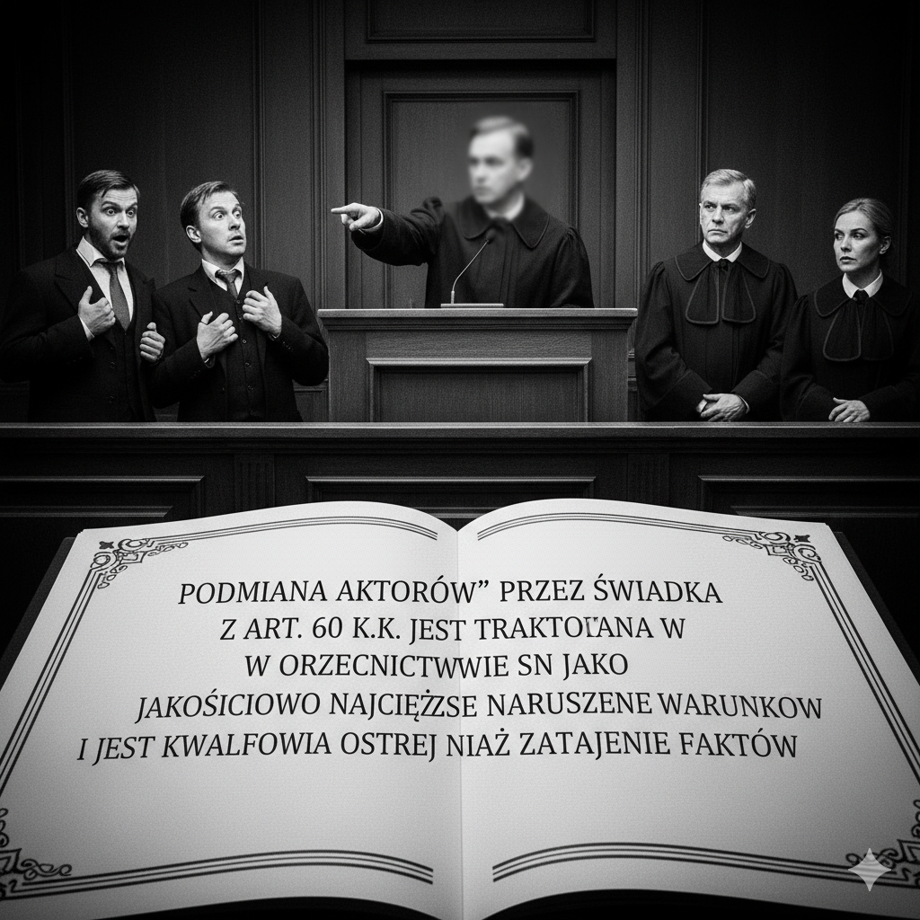 Rzeczowo i precyzyjnie — „podmiana aktorów” przez świadka z art. 60 k.k. jest traktowana w orzecznictwie SN jako jakościowo najcięższe naruszenie warunków współpracy. Ma to bardzo konkretne konsekwencje. 1. Jak SN kwalifikuje „podmianę aktorów” W linii orzeczniczej SN nie jest to traktowane jako: Tylko jako: aktywne wprowadzenie organów ścigania w błąd, które: SN wielokrotnie podkreślał […]